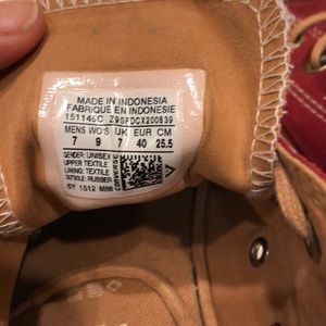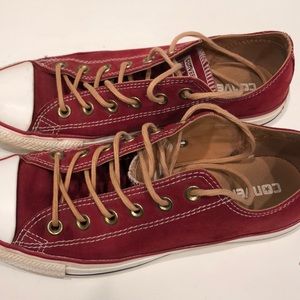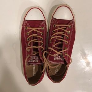 Red suede, light brown laces converse shoes