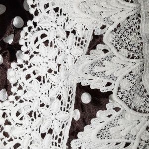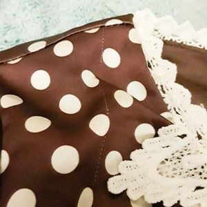 Brown/White Lace & Polka Dots Midi Dress. Elegant, Chic, Stylish. Has gorgeous satin rosette & lace applique on the bodice. The 16" to 17" sleeves & hem are trimmed in delicate lace. Hidden zipper in back. Silky satin polyester blend fabric. The bodice is lined. True to size. These are new but please note that are few light snags on the bodice as shown (from the factory) that are hard to notice when worn, thus selling at a reduced price. Shown with & without flash