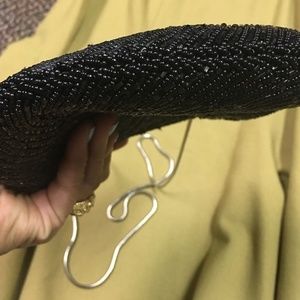 Vintage black purse handbag clutch wristlet shoulder bag with black beaded design and lovely gold snake chain. Excellent vintage condition with little--if any signs of wear.