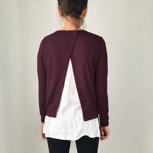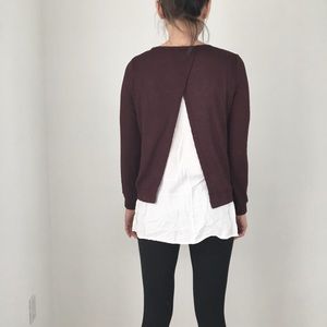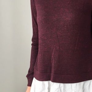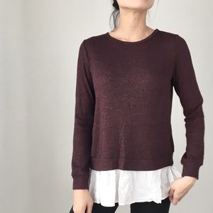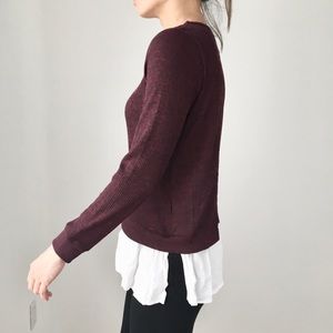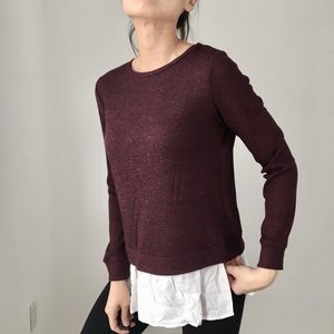 Lovely DEEP BURGUNDY ribbed long sleeve with faux two piece. Great quality top. Split back with faux ivory shirt under. Easy wear and chic.