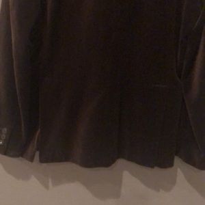 Rich chocolate brown velvet two button blazer with stitch details. Two flap pockets, and double venting in back. Fully lined. Size Medium.