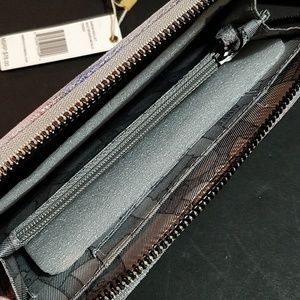 Pebble leather body, zip-around closure, as well as eight credit card pockets, two larger pockets, and a coin zip pocket. - Zip closure with wristlet pull - Interior features 4 card slots, 2 slip pockets, 1 interior zip pocket - Approx. 4" H x 7" W x 1" D - Approx. 6" strap