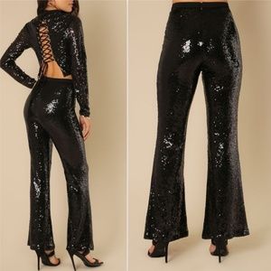 Black Bell Bottom Laced up front Sequins Pants