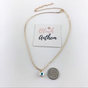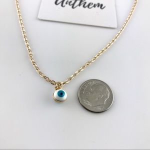 18 inches. 2 inch extender. Zinc alloy metal fashion jewelry. Gold tone with acrylic white evil eye pendant.