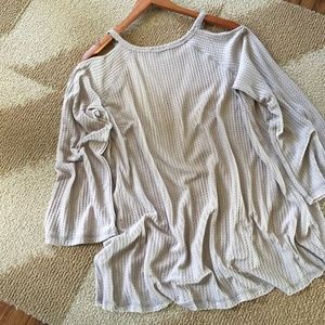 Darling Boutique Sweater. Featuring a soft grey knit, modern hems, a slight cold shoulder and flattering fit.