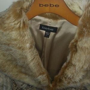 Gorgeous fitted new rabbit fur lots of detail. Looks cool with white T Jean's & boots. Definitely a staple in your wardrobe. 2 eye lit hooks..can be worn open or closed. This would fit med or small large. Bebe can run small. Kind of leopard motif in the fur. Mint condition