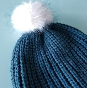 Too cute blue beanie with white faux fur Pom Pom. Great accessory for the weather
