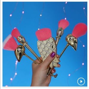 5 full-size brushes with supersoft, cruelty-free punchy pink bristles & gold handles with tropical designs