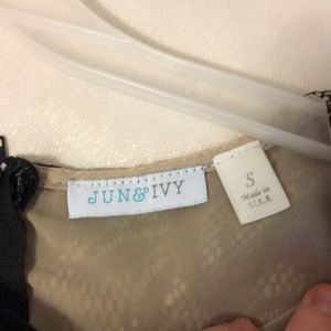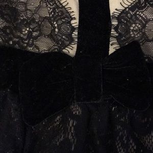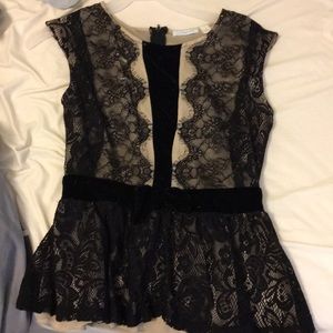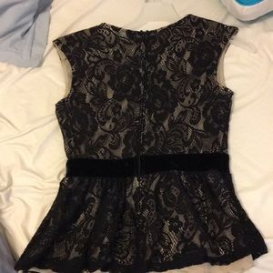 I great condition! Black lace with tan beneath it. Great for the office or a formal event. Has velvet down the middle with a velvet bow. So cute and very comfy to wear. Goes great with a black skirt or black pants and heels. Dress it up or down. Zipper in back so it’s easy to put on. Purchased at francesca’s.