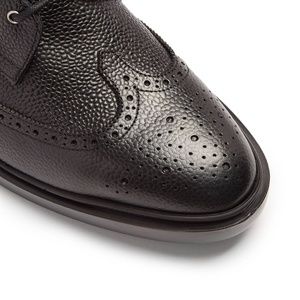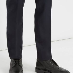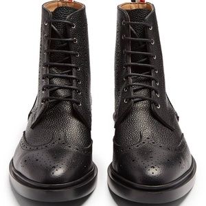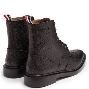 The tricolour tab at the back of these black grained-leather boots is a strong Thom Browne signature. The chunky, round-toe shape is crafted to reach over the ankle and detailed with traditional wingtip brogue perforations. A sturdy black rubber sole ensures traction on city streets. Runs true to size.