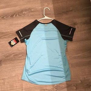 This was never worn before!! It’s sky blue and charcoal gray sleeves and the material is light weight and made for working out in!