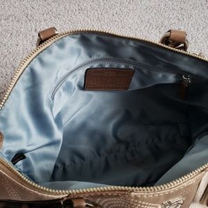 Used Cream Coach shoulder purse. Outside is in good condition (including straps) but does have 2 stains (see pictures 6- bottom right corner & 7- bottom side). Inside does have staining due to make up on right side of bag.(see last picture) Otherwise zip pocket and two side pockets have no issues. Measures 17"x12". No trades please!