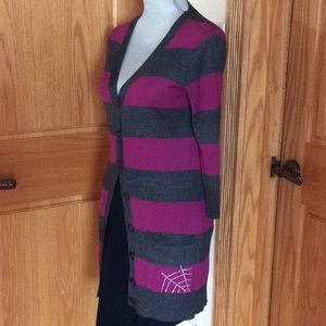 Pre-loved Two tone striped cardigan with rhinestone spider and web on the back and details on the front pockets.