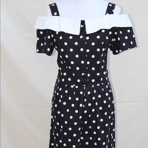 Adorable 1980s Stuart Allen Black & White Polka Dot Off the Shoulder Romper. In Excellent, New condition. Fits Medium-Large.