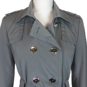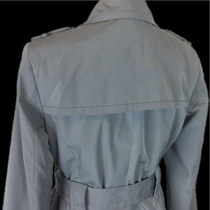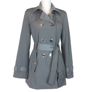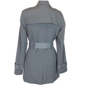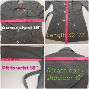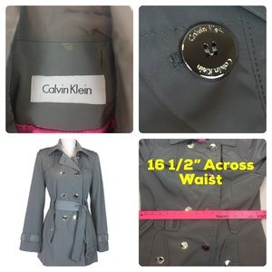 Light silver gray Calvin Klein belted trench jacket double breasted with pink silky lining with a water resistant texture. Size tag has been removed. Calvin Klein outerwear size chart included in photos. This fits my daughter which is a size 4/6 so I’d assume it could be worn as a small or extra small. Please compare the measurements in the photos prior to purchasing. Thanks🙂