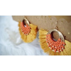 NEW! Mustard Yellow Tangerine Triple Hoop Tassel Fan Earrings