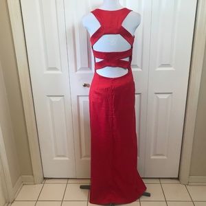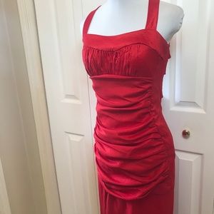 Jessica McClintock Red Ruched Holiday Gown sz 8 with Cut Out Back and Front Side Slit