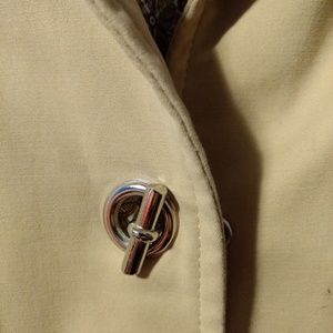 look fabulous on a rainy day wearing this Khaki Rain Coat by George. Fully lined with a beautiful patent of browns and purple. Forefront fish eye closures/hooks along with each sleeve. The underneath of the collar is patterned, as well. It's not brand new but no one would know it does have a tiny bit of a tear starting in the left pocket (1/8 of ") I will not be fixing. You will not get a better jacket for this price make me an offer.