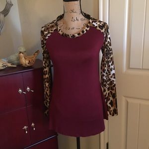 Maroon Top with Animal Print Sleeves and Trim