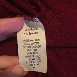 Very soft top perfect to dress up or dress down. Maroon body with animal print sleeves and trim. 96% Rayon and 4% Spandex.