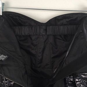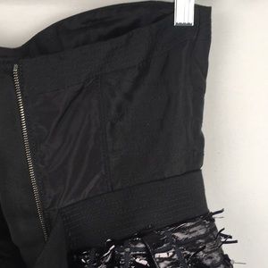Festive black strapless dress with fitted structured bodice. Inside of the bodice has rubber around top to keep it in place as well as an extra strap. The bottom of the dress is black and is cover in metallic tinsel.