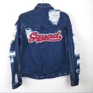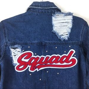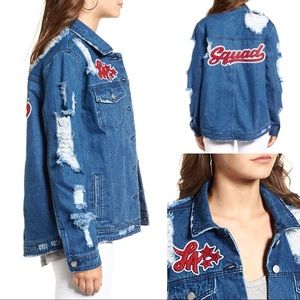 New with tags TINSEL oversized distressed faded denim jacket. Embroidered LA patch. Squad on back, silver round studs. Star detail on front. 2 front button chest pockets. 2 hip pockets. Button front. Fold down collar. Destroyed sleeves. White fraying at hem and cuffs. On trend. Great layer for fall. Can comfortably fit up to a size M. 100% cotton.