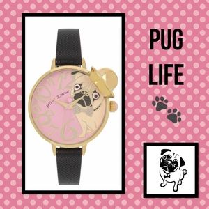 Betsey Johnson Pink Pug in a Hat Black Strap Watch