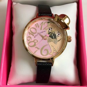 This adorable pug in a hat is perched atop this Betsey gold case, pink face watch.