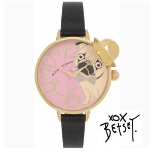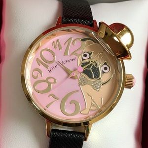 NIB Betsey Johnson Pink Pug in a Hat Black Strap Watch BJ00687-02BX