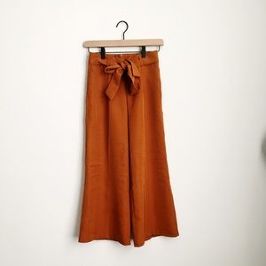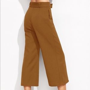These cute pants are perfect for days at the office! Sits at mid waist and features a wide leg, capri cut. Pants come with a matching waist tie belt. Fabric is comfy, but has no stretch.