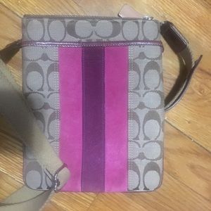 Authentic coach signature canvas bag with two tone suede strips. Zippered pocket and long shoulder strap