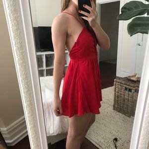 *ONLY WORN ONCE* The Jetset Diaries Lotus Romper in red. Straps are adjustable in the back and the front laces up. Side zipper on the left and it has pockets!
