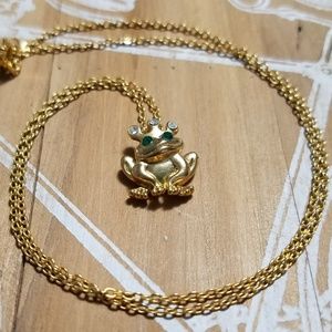 Small gold tone frog with a cute little crown. Green rhinestone eyes and clear rhinestone jewels on the crown.