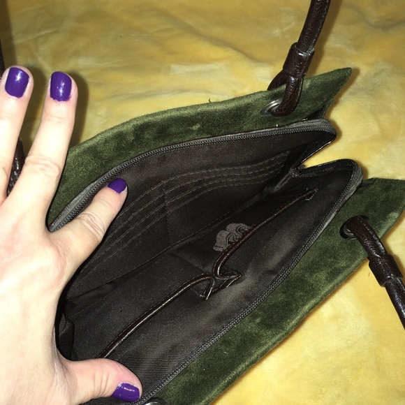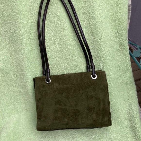 Beautiful olive green faux suede mini purse. Double handles, two side compartments, one with a zip pocket, and a center compartment with eight card slots, two slip pockets, and two pen/stylus loops. In excellent used condition.