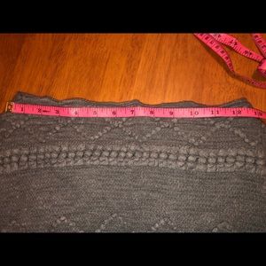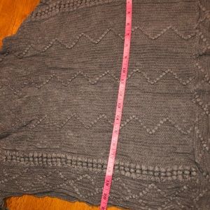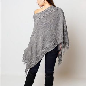 Gray fringe trim knit poncho. Asymmetrical hem. Soft and so comfy! Sweater fabric, 100% acrylic, not very heavy. No armholes. Pullover. One size fits most US women’s sizes 2-14. Could be used as outerwear in fall or warmer climate winters or as a top with a cami, tank top, tee, or long sleeve tee underneath. So cute with leggings, simple skirt, or skinny jeans. Smoke free home. Reasonable offers always welcome! 🌸