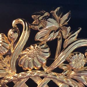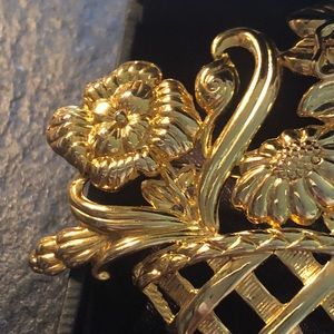 This substantial, stunning and very detailed shiny gold-tone vintage Basket of Flowers brooch pin measures 3” x 2-3/4”. The back has a rolling c-clasp closure. In excellent preowned condition. Smoke-free home.