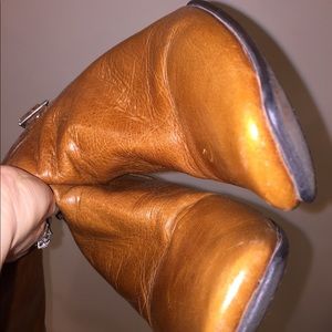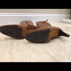 Italian leather (inner & upper) boots. I have a slim foot and these fit comfortably; if you have a wide foot these may not fit. Gently worn; see pictures. Never worn with bare foot. All leather, even the soles which at some point will need replacement but can easily go another season or two without. Circumference at the top of shaft is 12-13” and has room for a finger. Made in Italy. Offers or questions welcome.