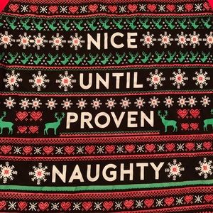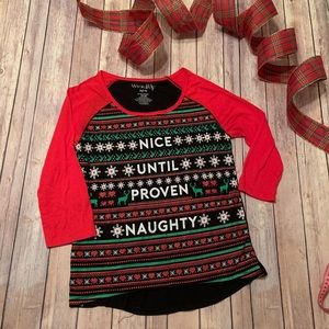 Black tee with 3/4 length bright red sleeves, ugly Christmas sweater-style print and “Nice until proven naughty”. Reindeers, snowflakes, hearts, and stars printed on front. Solid black back.