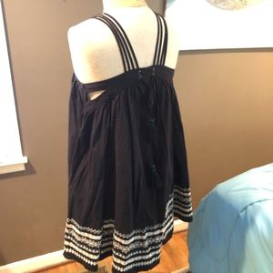 Fun cotton piece—top or dress. I wore as a top—I’m 5’9”. Cute detailing in the straps, sides and string tie closure on back with tassels. The embroidery is white with blue and mauve. XS size, but fit me great—I’m typically a small.