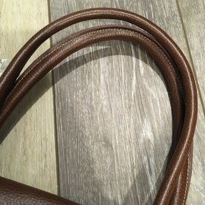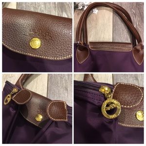 Small purple tote by Longchamp. Folds up for easy storage. Embossed leather accents. Nylon fabric for easy cleaning and durability.