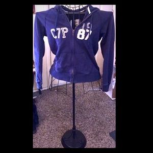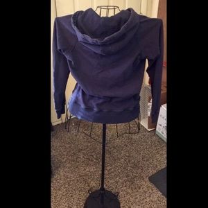 Comfortable navy zipper in both ends of the hoodie. Form fitting and perfect layering piece. Great for fall, winter, and spring.