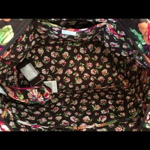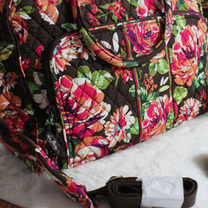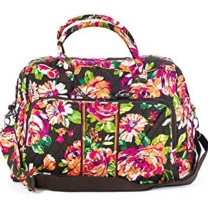 Trolley sleeve. Fully zippered front compartment and two back slip pockets. Wide opening with double zippers and a sturdy, removable base. Five inner pockets. Zip closure. Carry-on compliant. Dimensions 18 ½" W x 12 ½" H x 7½" D with 6 ½" strap and 48 ½" adjustable, removable shoulder strap Great holiday gift. *multiple bags available