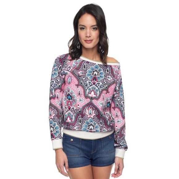 Off-the-shoulder neckline, long sleeves with elastic cuffs, Power prints in vivid colors on effortless True to Size L