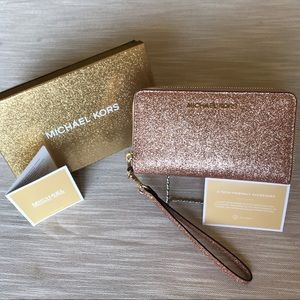 Michael Kors Rose Gold Glitter Phn Case Zip Wallet
