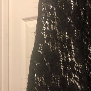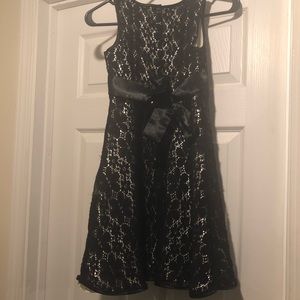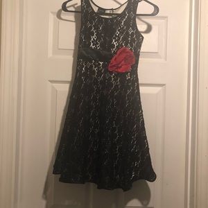 Girls Holiday Editions dress 10/12 black lace with cream colored lining and red flower accent. Now I’m back. Please see all pics for the slight fraying if lace. Not noticeable unless up close. Perfect for a school Christmas concert.