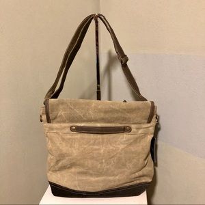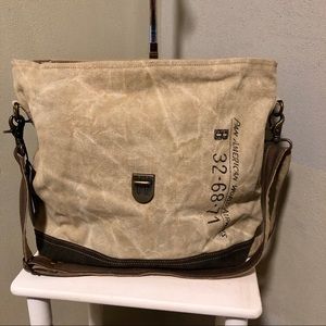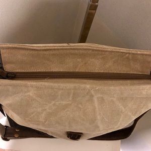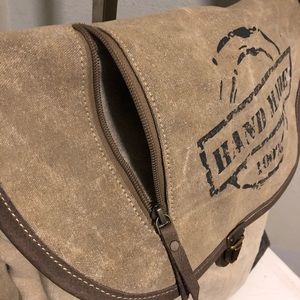 This bag is made of up-cycled materials including canvas and leather. Natural vegetable tanning processes are used.