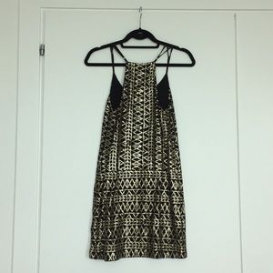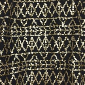 Black with gold sequence dress. Perfect for NYE. Adjustable straps. Above the knee. Great condition.