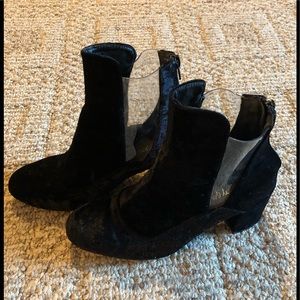 Fun velvet and clear cut out booties in size 6. Heels are 3”. They are in great condition.