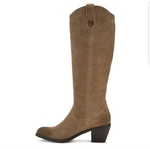 Genuine Suede Leather in taupe adds a luxe touch - Thick 2-inch heel adds stability - Hits just below the knee Beautifully crafted and endlessly versatile. Suede Leather Pull On Boots are made from genuine leather for major durability. The slight western style adds a dash of cowgirl flair to any outfit. Calf circumference 14"