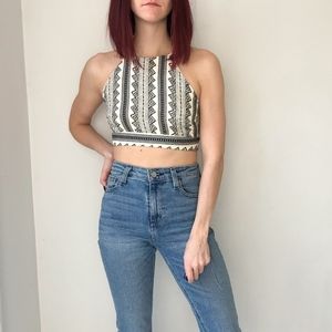 Crop top in a cute aztec print (off-white/black combo). Completely open back. Straps are adjustable, and the back is a bowtie closure. I got this at a local boutique, the brand says " Fashion On Earth". Lined. Great for summer parties or vacation! It is a medium, but runs small.